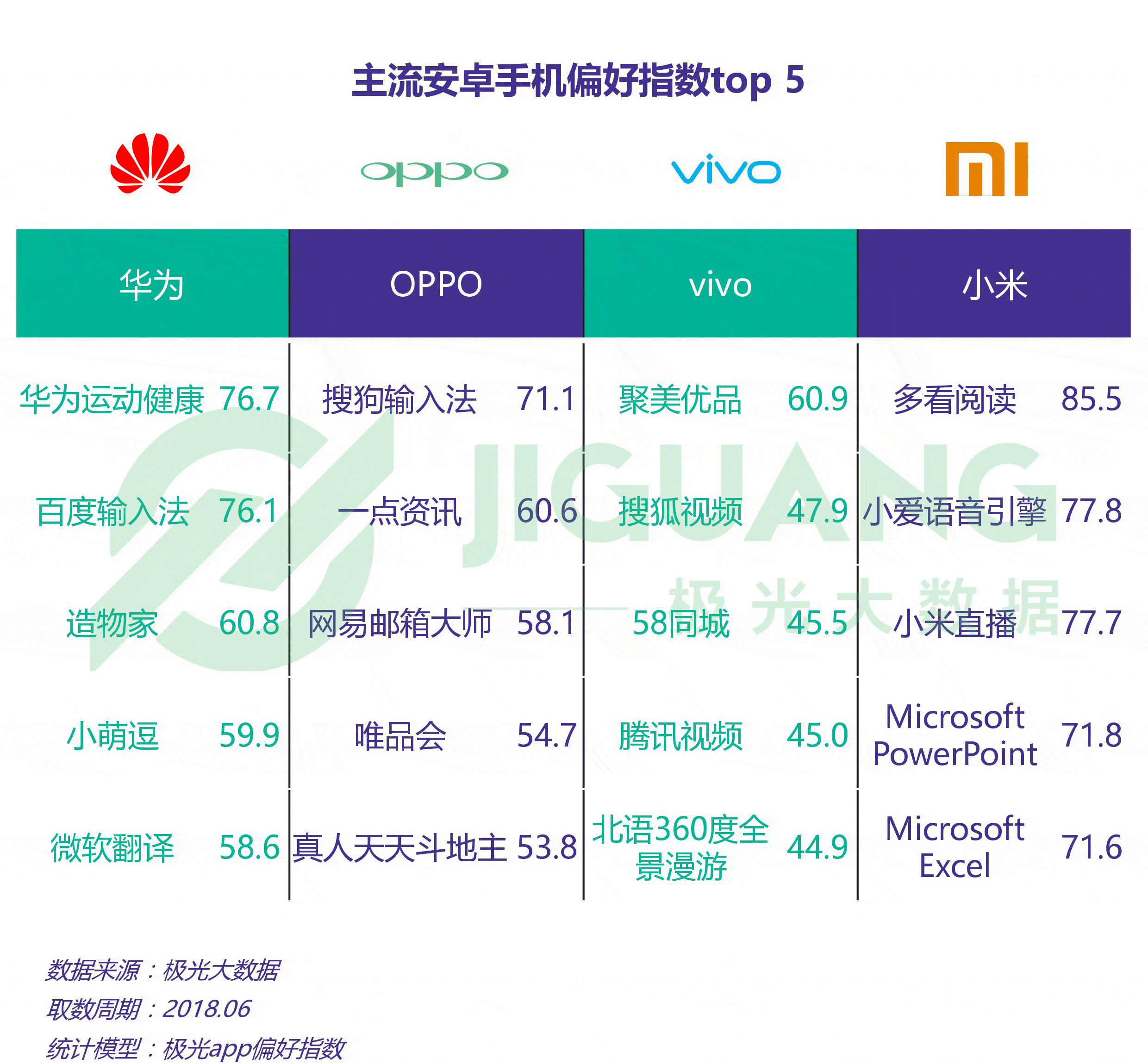 极光大数据显示,华为、OPPO、vivo和小米用户最偏爱的app分别是华为运动健康、搜狗输入法、聚美优品和多看阅读